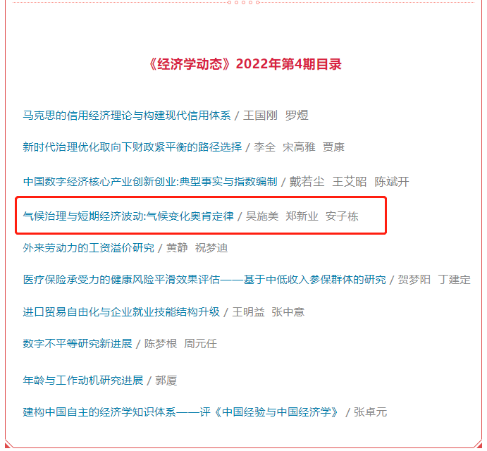 评估碳中和背景下气候变化政策与就业的周期性关系,不仅能够帮助决策者制定更加科学合理的减排政策,也对稳定就业和宏观经济具有重要意义,有助于贯彻新发展理念,统筹推进我国高质量发展。该研究成果以“气候治理与短期经济波动:气候变化奥肯定律”为题发表在《经济学动态》,吴施美副教授(湖南大学经济与贸易免费色情片)为论文的第一作者,郑新业教授为论文的通讯作者,安子栋副教授为合作者。